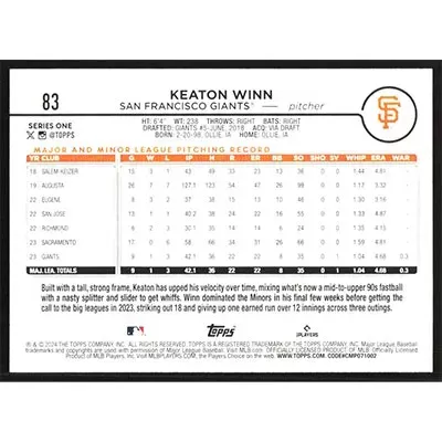 This is a 2024 Topps Keaton Winn baseball card. The card is #83 and pictures show condition.