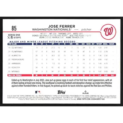 This is a 2024 Topps Jose Ferrer baseball card. The card is #85 and pictures show condition.