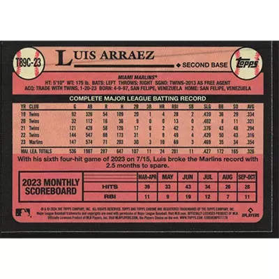 This is a 2024 Topps '89 Silver Pack Chrome Luis Arraez baseball card. The card is #T89C-23 and pictures show condition.