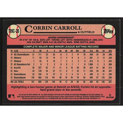 This is a 2024 Topps '89 Silver Pack Chrome Corbin Carroll baseball card. The card is #T89C-26 and pictures show condition. Team(s): Arizona Diamondbacks