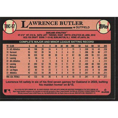 This is a 2024 Topps '89 Silver Pack Chrome Lawrence Butler baseball card. The card is #T89C-57 and pictures show condition. Team(s): Oakland Athletics Rookie Card (RC)