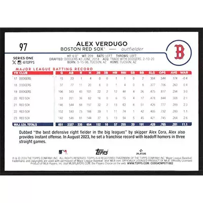 This is a 2024 Topps Alex Verdugo baseball card. The card is #97 and pictures show condition.