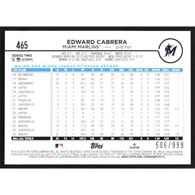 This is a 2024 Topps Blue Foil Edward Cabrera baseball card. The card is #465 and pictures show condition. This card is limited; #'d 506/999. Team(s): Miami Marlins