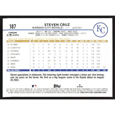 This is a 2024 Topps Chrome Steven Cruz baseball card. The card is #187 and pictures show condition.