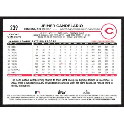This is a 2024 Topps Chrome Jeimer Candelario baseball card. The card is #239 and pictures show condition.