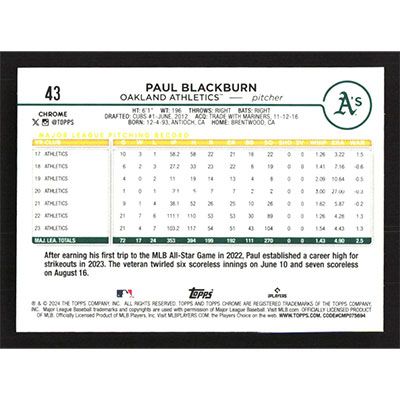 This is a 2024 Topps Chrome Paul Blackburn baseball card. The card is #43 and pictures show condition.