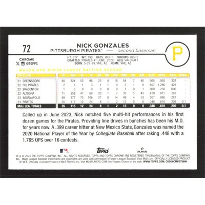 This is a 2024 Topps Chrome Nick Gonzales baseball card. The card is #72 and pictures show condition.