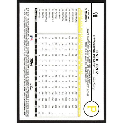 This is a 2024 Topps Chrome Oneil Cruz baseball card. The card is #98 and pictures show condition.