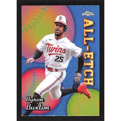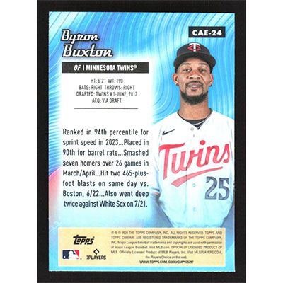 This is a 2024 Topps Chrome All Etch Byron Buxton baseball card. The card is #CAE-24 and pictures show condition.