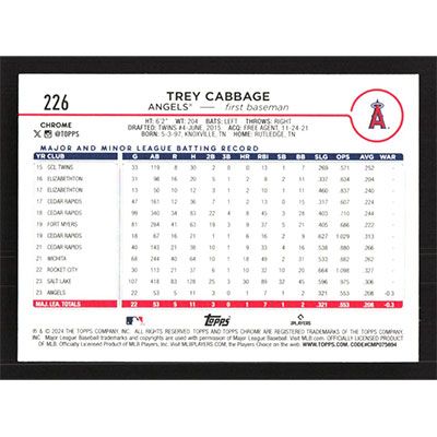 This is a 2024 Topps Chrome Green RayWave Refractors Trey Cabbage baseball card. The card is #226 and pictures show condition. This card is limited; #'d 16/99.