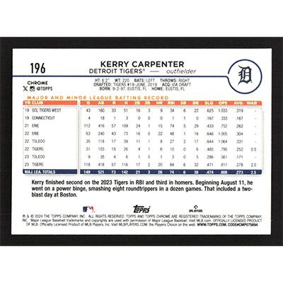 This is a 2024 Topps Chrome Pink Refractors Kerry Carpenter baseball card. The card is #196 and pictures show condition.