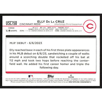 This is a 2024 Topps Chrome RayWave Refractors Elly De La Cruz Rookie Debut baseball card. The card is #USC150 and pictures show condition. Team(s): Cincinnati Reds Rookie Card (RC)
