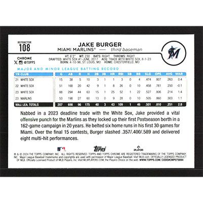 This is a 2024 Topps Chrome Refractors Jake Burger baseball card. The card is #108 and pictures show condition.