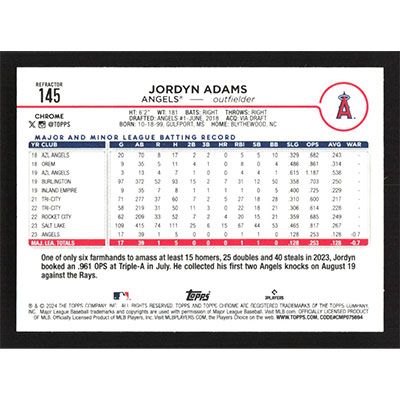 This is a 2024 Topps Chrome Refractors Jordyn Adams baseball card. The card is #145 and pictures show condition. Team(s): Los Angeles Angels Rookie Card (RC)