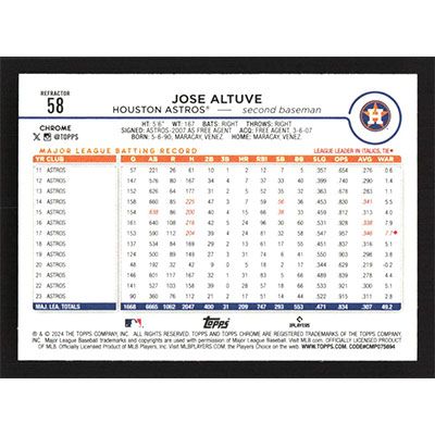 This is a 2024 Topps Chrome Refractors Jose Altuve baseball card. The card is #58 and pictures show condition.