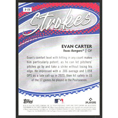 This is a 2024 Topps Chrome Strokes Evan Carter baseball card. The card is #S-23 and pictures show condition. Team(s): Texas Rangers Rookie Card (RC)