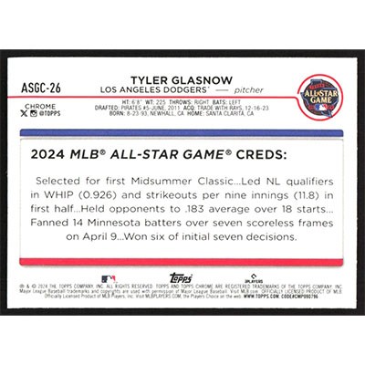 This is a 2024 Topps Chrome Update '24 All-Star Game Tyler Glasnow baseball card. The card is #ASGC-26 and pictures show condition. Team(s): Los Angeles Dodgers