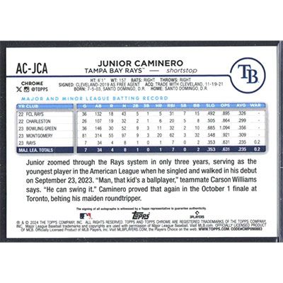 This is a 2024 Topps Chrome Update Autographs Green Refractors Junior Caminero autographed baseball card. This card has been signed, in blue, by Junior Caminero, and is certified authentic by Topps. The card is #AC-JCA and pictures show condition. This card is limited; #'d 65/99.