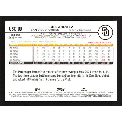 This is a 2024 Topps Chrome Update RayWave Refractors Luis Arraez baseball card. The card is #USC100 and pictures show condition. Team(s): San Diego Padres