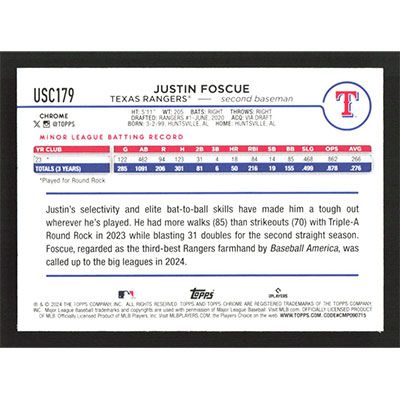 This is a 2024 Topps Chrome Update RayWave Refractors Justin Foscue baseball card. The card is #USC179 and pictures show condition. Team(s): Texas Rangers Rookie Card (RC)