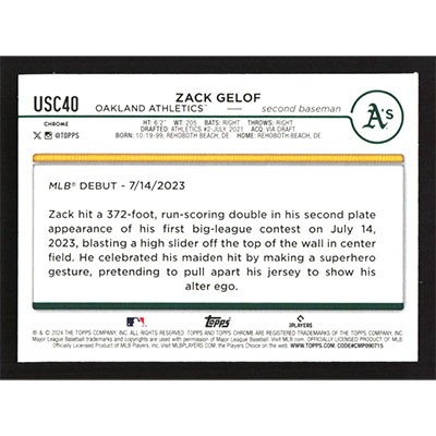 This is a 2024 Topps Chrome Update RayWave Refractors Zack Gelof Rookie Debut baseball card. The card is #USC40 and pictures show condition. Team(s): Oakland Athletics Rookie Card (RC)