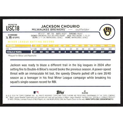 This is a 2024 Topps Chrome Update Refractors Jackson Chourio baseball card. The card is #USC18 and pictures show condition.