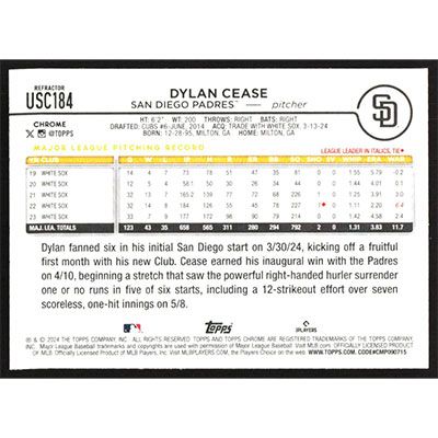 This is a 2024 Topps Chrome Update Refractors Dylan Cease baseball card. The card is #USC184 and pictures show condition.