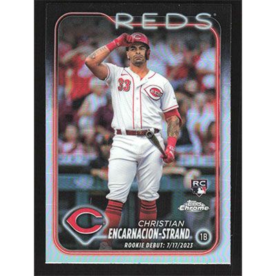 This is a 2024 Topps Chrome Update Refractors Christian Encarnacion-Strand Rookie Debut baseball card. The card is #USC92 and pictures show condition. Team(s): Cincinnati Reds Rookie Card (RC)