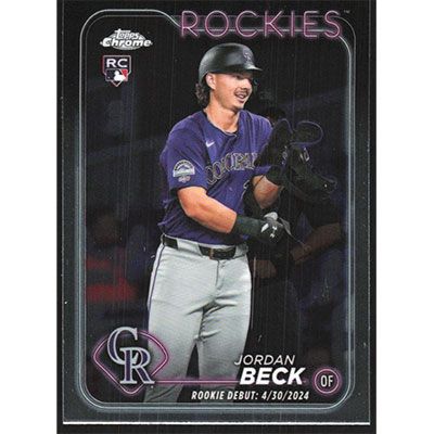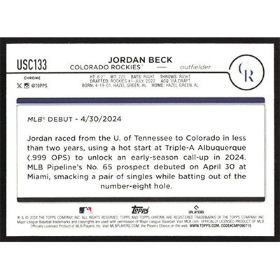 This is a 2024 Topps Chrome Update Jordan Beck Rookie Debut baseball card. The card is #USC133 and pictures show condition.