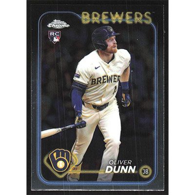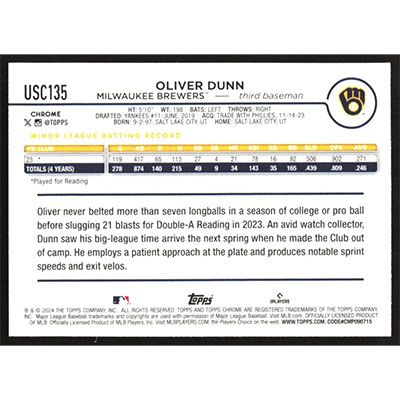 This is a 2024 Topps Chrome Update Oliver Dunn baseball card. The card is #USC135 and pictures show condition.