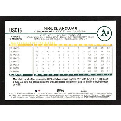 This is a 2024 Topps Chrome Update Miguel Andujar baseball card. The card is #USC15 and pictures show condition.