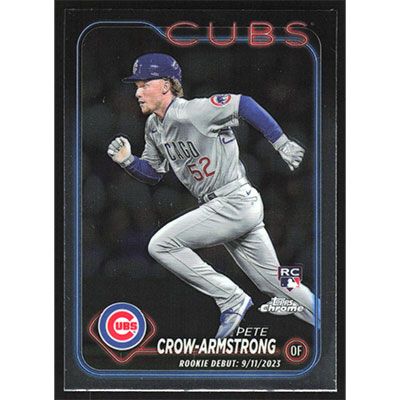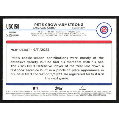 This is a 2024 Topps Chrome Update Pete Crow-Armstrong Rookie Debut baseball card. The card is #USC158 and pictures show condition. Team(s): Chicago Cubs Rookie Card (RC)