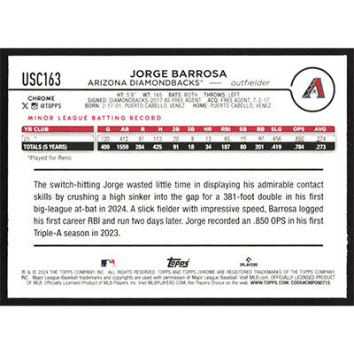 This is a 2024 Topps Chrome Update Jorge Barrosa baseball card. The card is #USC163 and pictures show condition. Team(s): Arizona Diamondbacks Rookie Card (RC)