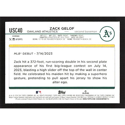 This is a 2024 Topps Chrome Update Zack Gelof Rookie Debut baseball card. The card is #USC40 and pictures show condition. Team(s): Oakland Athletics Rookie Card (RC)
