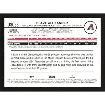 This is a 2024 Topps Chrome Update Blaze Alexander Rookie Debut baseball card. The card is #USC53 and pictures show condition. Team(s): Arizona Diamondbacks Rookie Card (RC)
