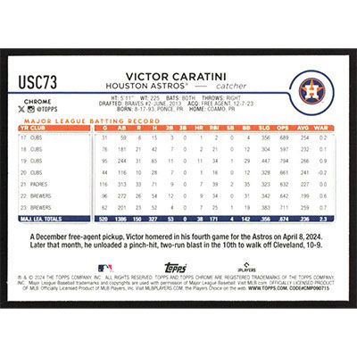 This is a 2024 Topps Chrome Update Victor Caratini baseball card. The card is #USC73 and pictures show condition.