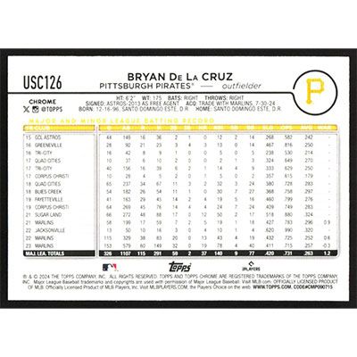This is a 2024 Topps Chrome Update X-Fractors Bryan De La Cruz baseball card. The card is #USC126 and pictures show condition. Team(s): Pittsburgh Pirates