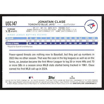 This is a 2024 Topps Chrome Update X-Fractors Jonatan Clase baseball card. The card is #USC147 and pictures show condition.