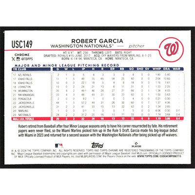 This is a 2024 Topps Chrome Update X-Fractors Robert Garcia baseball card. The card is #USC149 and pictures show condition. Team(s): Washington Nationals Rookie Card (RC)
