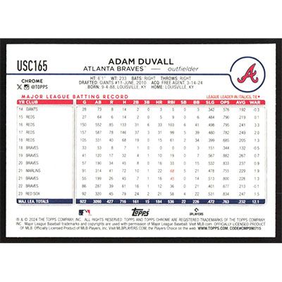 This is a 2024 Topps Chrome Update X-Fractors Adam Duvall baseball card. The card is #USC165 and pictures show condition.