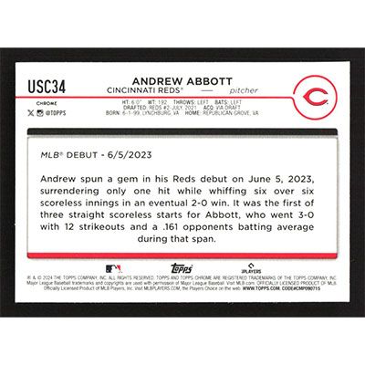 This is a 2024 Topps Chrome Update X-Fractors Andrew Abbott Rookie Debut baseball card. The card is #USC34 and pictures show condition.