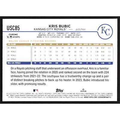 This is a 2024 Topps Chrome Update X-Fractors Kris Bubic baseball card. The card is #USC85 and pictures show condition.
