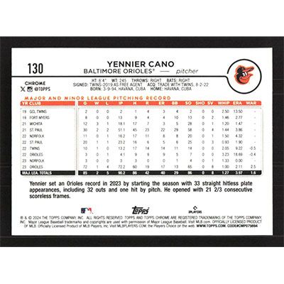 This is a 2024 Topps Chrome X-Fractors Yennier Cano baseball card. The card is #130 and pictures show condition.