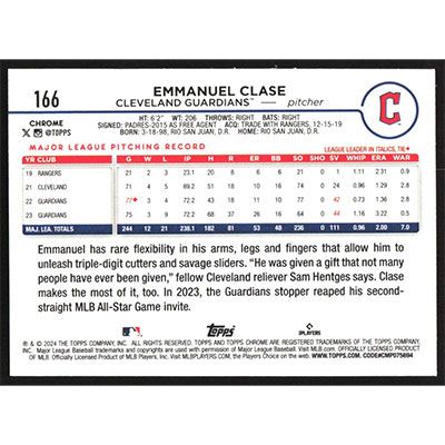 This is a 2024 Topps Chrome X-Fractors Emmanuel Clase baseball card. The card is #166 and pictures show condition.