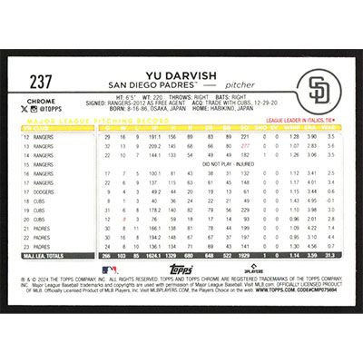 This is a 2024 Topps Chrome X-Fractors Yu Darvish baseball card. The card is #237 and pictures show condition.