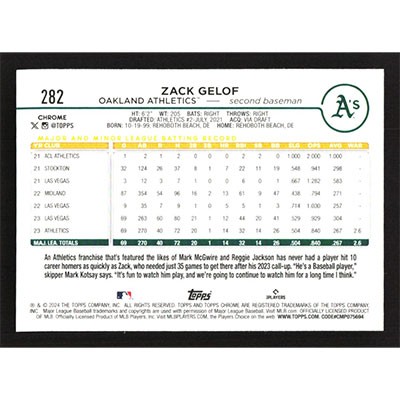 This is a 2024 Topps Chrome X-Fractors Zack Gelof baseball card. The card is #282 and pictures show condition. Team(s): Oakland Athletics Rookie Card (RC)