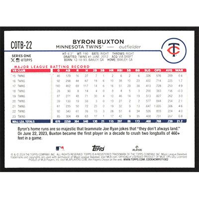 This is a 2024 Topps Companion Cards Byron Buxton baseball card. The card is #COTB-22 and pictures show condition.