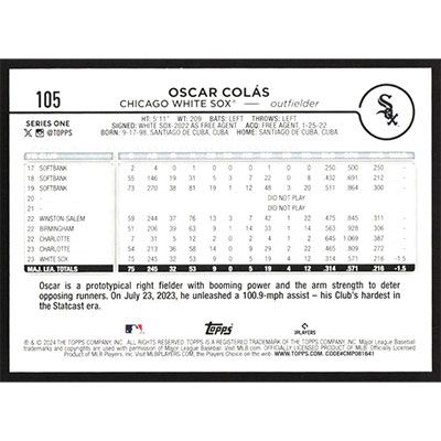This is a 2024 Topps Easter Foil Oscar Colas baseball card. The card is #105 and pictures show condition.