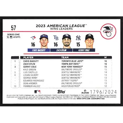This is a 2024 Topps Gold Chris Bassitt, Zach Eflin and Gerrit Cole League Leaders baseball card. The card is #57 and pictures show condition. This card is limited; #'d 1796/2024.