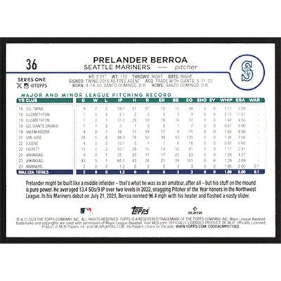 This is a 2024 Topps Gold Foil Prelander Berroa baseball card. The card is #36 and pictures show condition. Team(s): Seattle Mariners Rookie Card (RC)